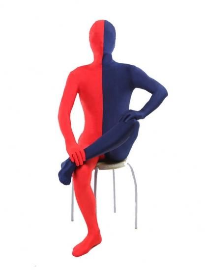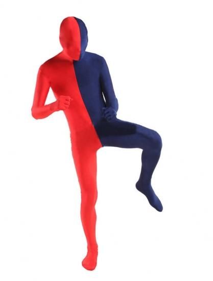 全身タイツ 大人用 紺色&レッド カラーブロック 開口部のない全身タイツ 仮装コスチューム弾力・伸縮性あり大人 男女共用 S M L XL 2XL 3XL 145cm-200cm 大きいサイズも対応